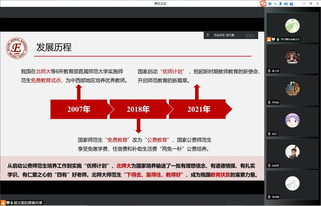 教育是立国之本,我们都很关心祖国的教育事业发展,当代教育所面临的问题我们青年人也看在眼里。国家开展中西部欠发达地区优秀教师定向培养的相关政策,以及咱们百廿京师对国家政策的积极响应、对教师教育使命的践行,都让我们相信教育事业的明天充满希望。而那些参与优师计划、投身祖国西部、扎根农村教育的,我们的同龄人们,更是值得我们最高的敬意。身在师大,纵然不为成为一名教师,也该学习校训品格,身为党员,更要培养“到祖国和人民最需要的地方去”的理想追求。