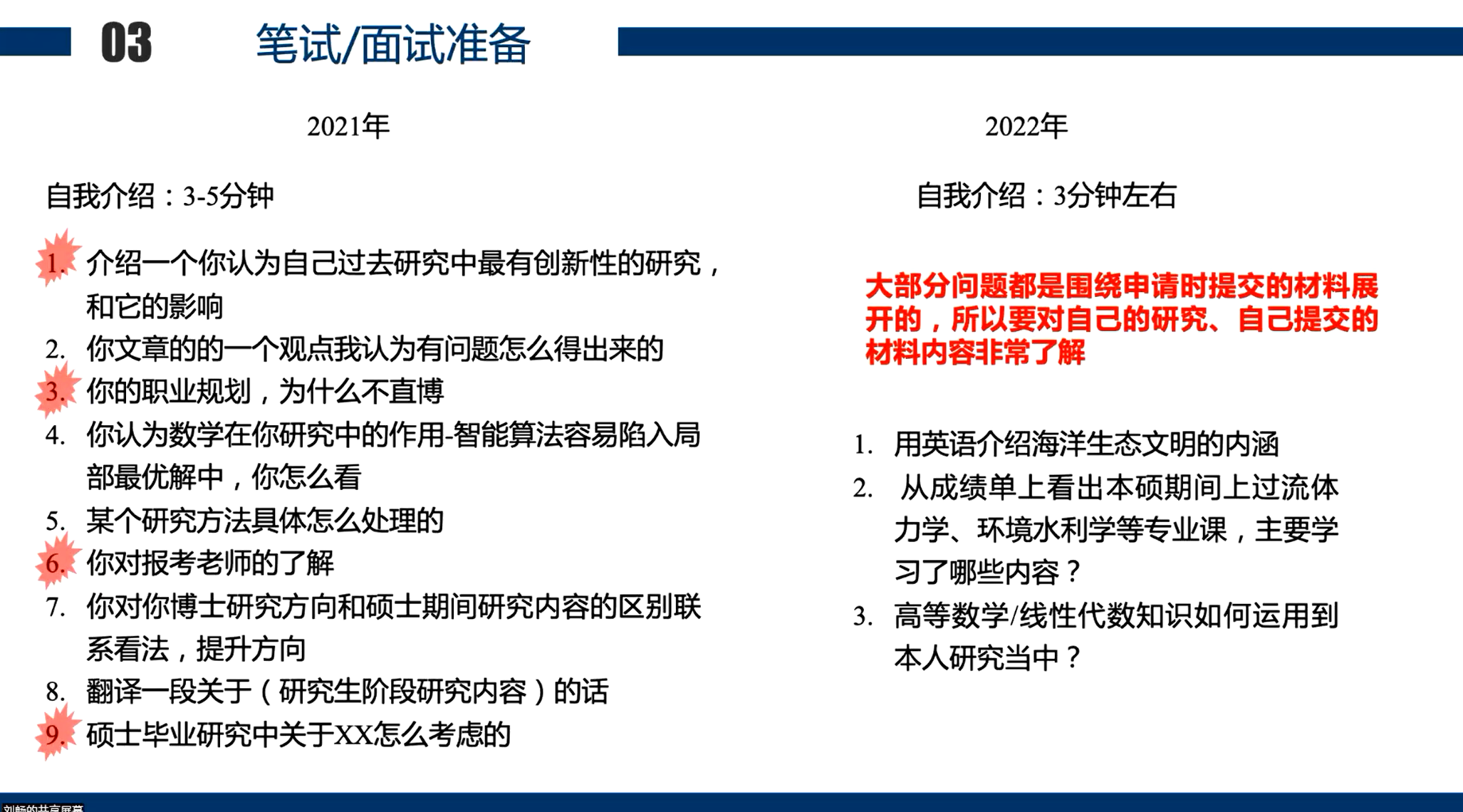 同时师姐贴心地为我们列出了初审申请材料清单,强调申请材料可以证明本人的科研经历或学术能力等;在复试环节师姐我们介绍了笔试和面试的考核内容并进行了自身的经验分享;最后师姐强调了大家要审慎考虑自己是否有兴趣和能力读博。在考博和硕转博两条路上师姐提出了自己的见解,选择考博时间成本更长,但有更长的考虑时间,可以总结硕士成果,培养科研写作能力。