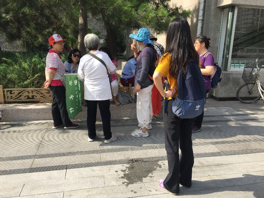 在9:10,我们从东直门出发,在园林专家陈老师的带领下沿着城墙开始了全程5公里的旅途。在东直门行进了20分钟,来到了公园,在公园内部我们一行人做了简单的自我介绍,公园鸟语花香,空气里弥漫着昨夜刚下的小雨后泥土混杂着花朵的特殊气味,大家经过介绍后,相互交谈,队员王嘉伟一路上就作为大学生对于乐水行的理解与几十年对于环境贡献的经验知识的陈老师相互交流,显得十分热闹。