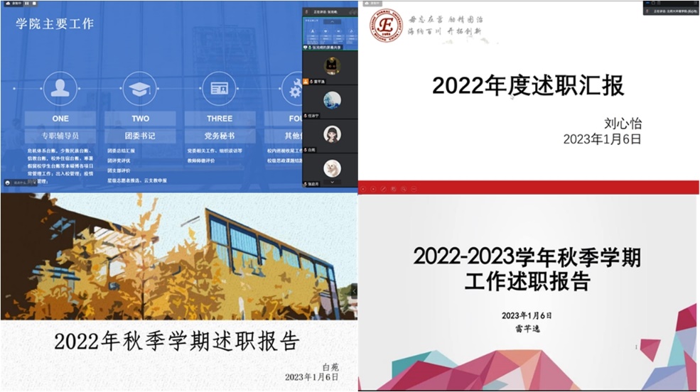学工办各位老师依次进行述职,从疫情防控、迎新工作、团学活动、就业推进、奖学金评定、班级建设和安全稳定等方面总结了秋季学期学生工作的各项事务,并基于个人分工介绍了春季学期工作思路和计划。