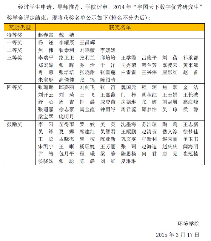 2014年“宇图天下”数字环保基金奖学金获奖名单